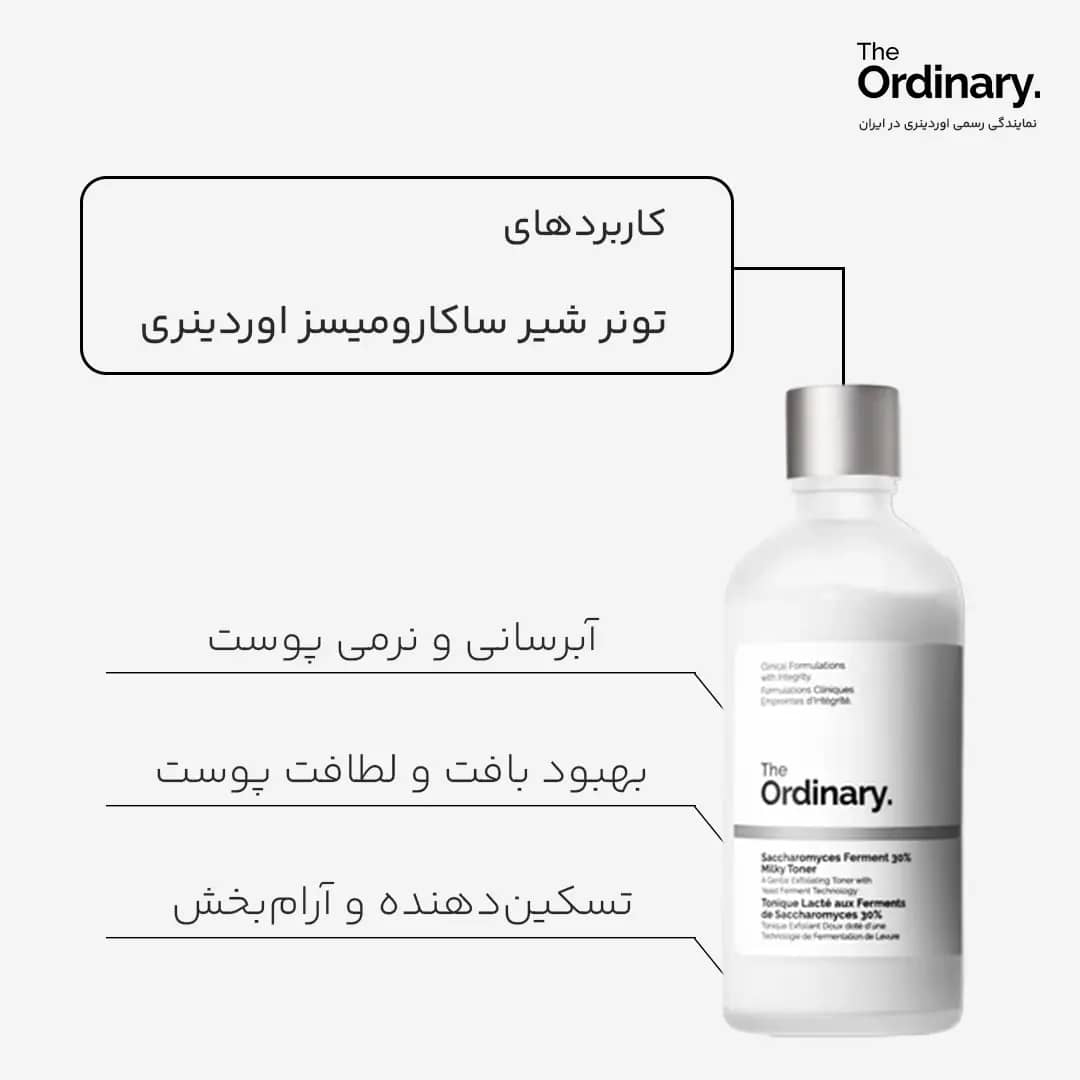 تونر شیر اوردینری حاوی ساکارومایسس تخمیر ضد حساسیت بوده و از قرمزی و خارش پوست جلوگیری می کند، التیام بخشی و رفع قرمزی از دیگر ویژگی های این تونر می باشد که موجب از بین رفتن حساسیت پوستی و روشن شدن پوست می گردد.این محصول باعث لایهبرداری ملایم سطح پوست میشود، با تأثیری مشابه اسیدها ولی بسیار ملایمتر («gentle exfoliating toner”)؛ کمک به صافتر شدن بافت پوست، کاهش ظاهر ناهمواریها، و درخشانتر شدن پوست. مرطوبکنندگی موثر و تقویت سد محافظتی پوست بعد از یک بار استفاده (۸ ساعت پس از مصرف). مناسب برای «همه نوع پوستها» اعلام شده، از جمله پوست خشک.